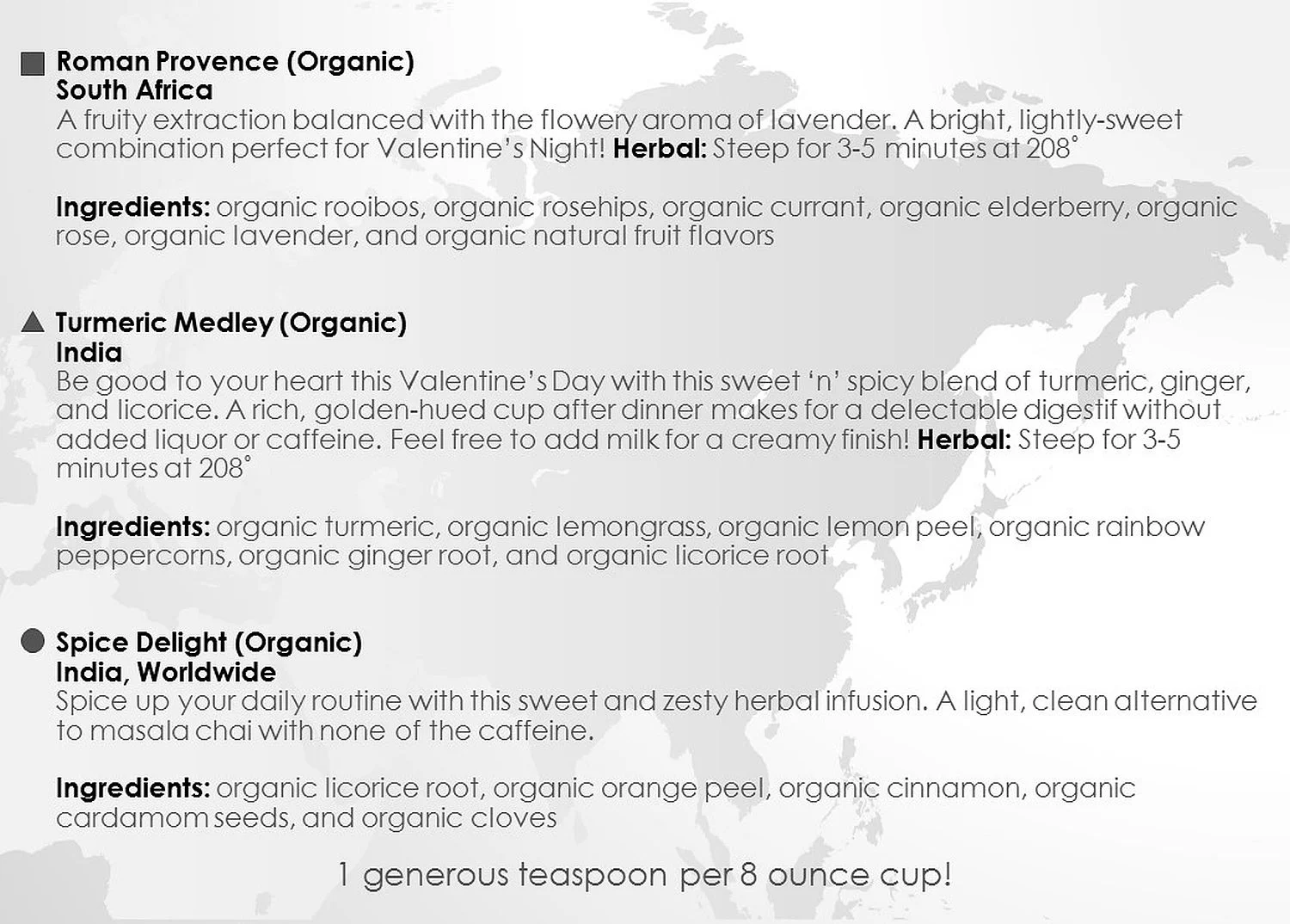 The following are pages from separate brochures that correspond to each of the three monthly subscription options, "Tea Purist," "Flavor in the Mix," and "Herbalist:"
